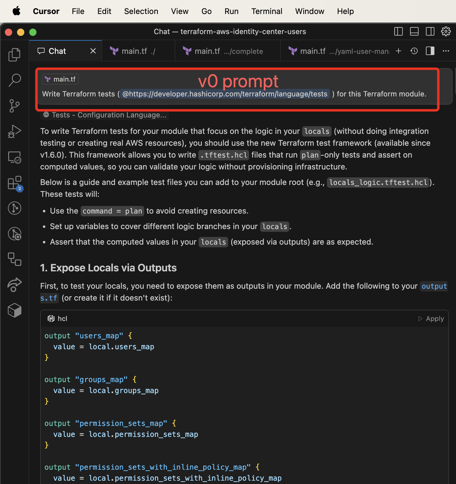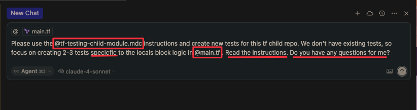 Our next step was to test out the refined prompt on other child modules. I continued using Cursor (and Sonnet-4) in Agent Mode to generate tests for two other modules, terraform-datadog-users